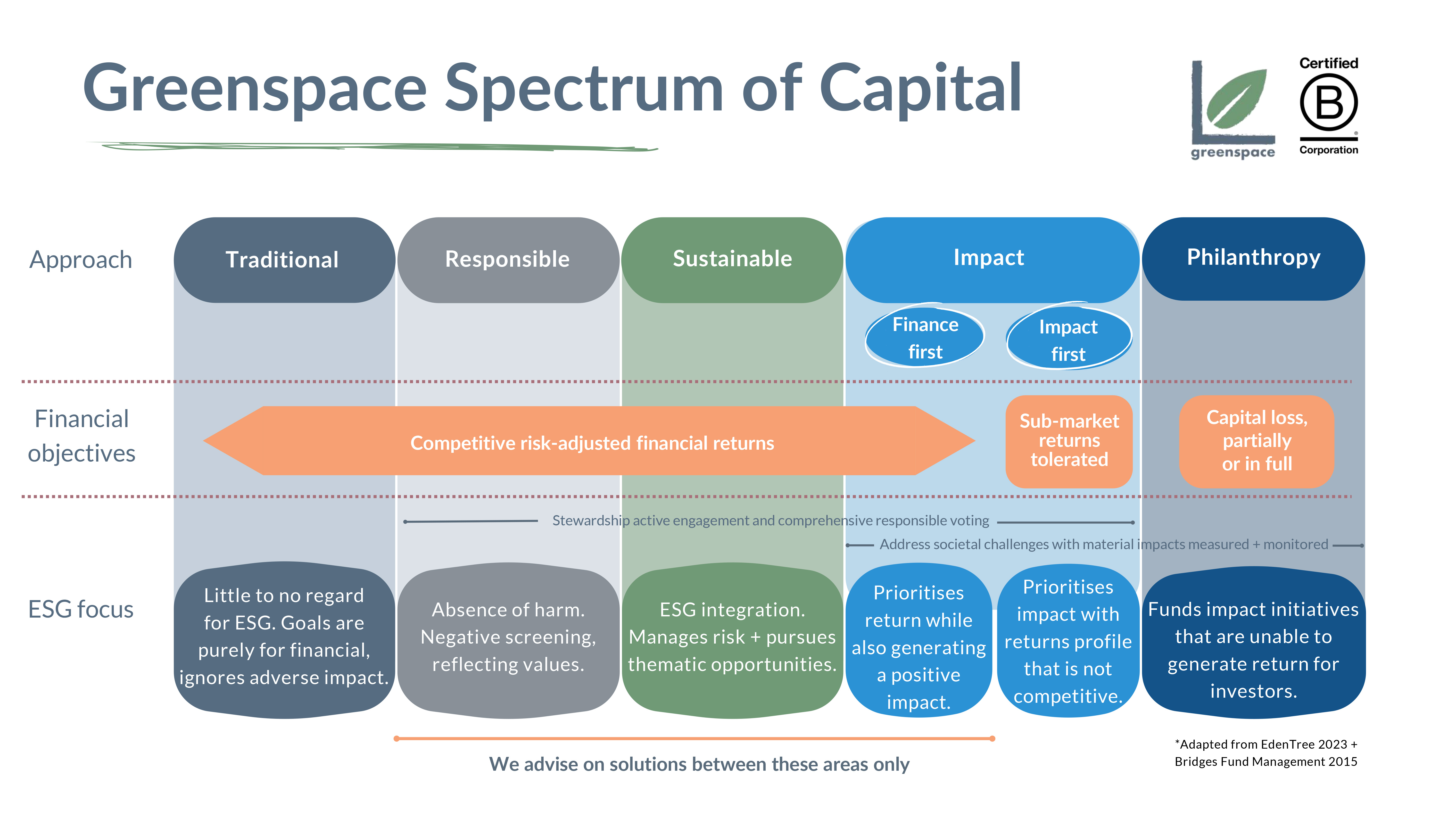 As well as your objectives around performance, costs and risk, our advice process is guided by the Spectrum of Capital. This is a framework that ranges from traditional investing through to responsible, sustainable, and fully impact-focused options. Wherever you sit on that spectrum, we’ll help you find the balance that feels right for you or your organisation.